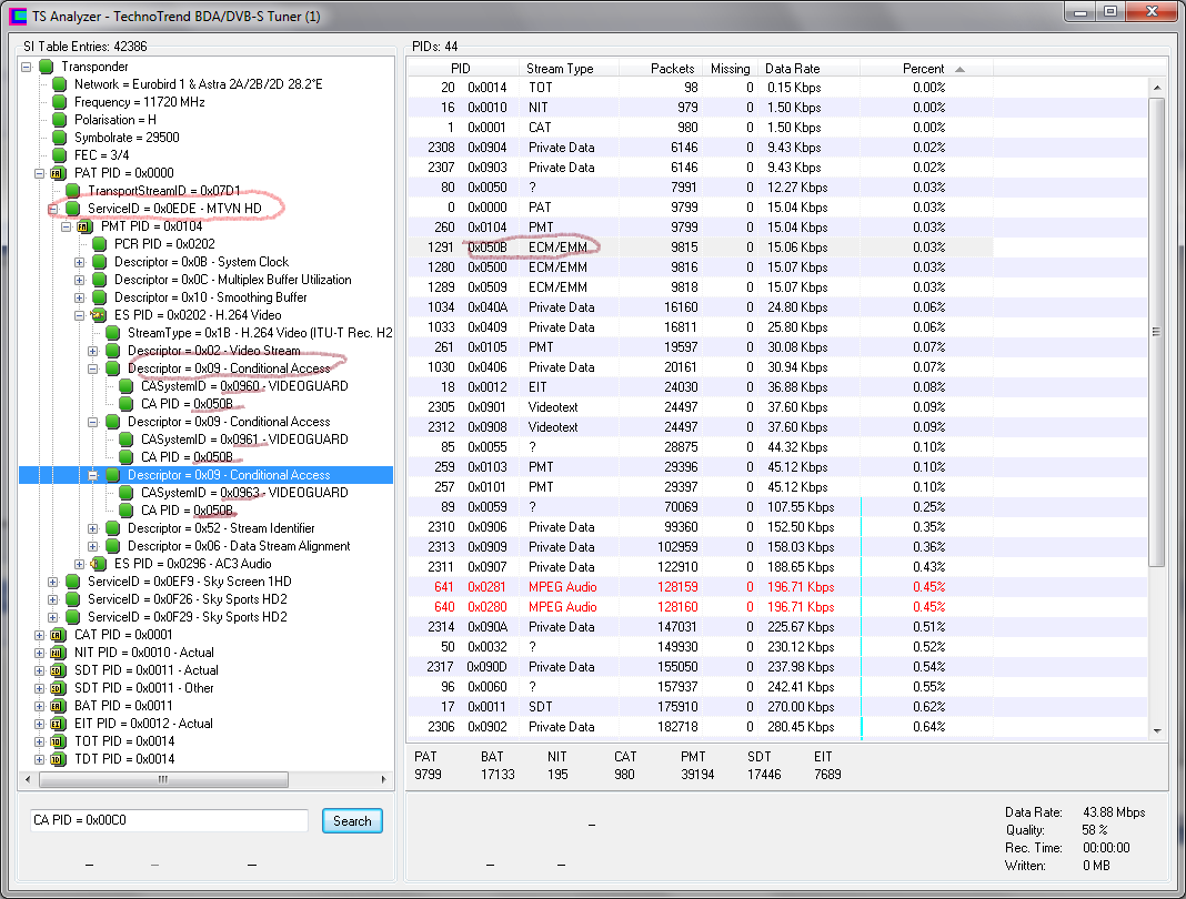 Карта SS Usb 2 HD CI. Вот лог. Причём больше он не обновляяется. Кстати, и на других транспондерах так же: часть каналов открывается, а часть - нет. 19:48:25.921 - servers[0] started: newcamd525:**.***.**.***:4000 19:48:26.890 - newcamd525:**.***.**.***:4000: connecting... 19:48:27.031 - newcamd525:**.***.**.***:4000: connection done. 19:48:27.156 - newcamd525:**.***.**.***:4000: random bytes received... 19:48:27.281 - newcamd525:**.***.**.***:4000: send DATA_REQ... 19:48:27.421 - newcamd525:**.***.**.***:4000: Authorization done. 19:48:27.421 - newcamd525:**.***.**.***:4000: Cards present: 19:48:27.421 - newcamd525:**.***.**.***:4000: CAID 0500, IDENT 023700 19:48:27.437 - newcamd525:**.***.**.***:4000: CAID 0500, IDENT 030600 19:48:34.171 - CAT received: 19:48:34.187 - 0000: 01 B0 41 FF FF E5 00 00 09 0C 05 00 E3 EB 13 01 ..A............. 19:48:34.187 - 0010: 20 14 03 03 06 00 09 0C 05 00 E3 E8 13 01 20 14 ............. . 19:48:34.187 - 0020: 03 02 37 00 09 0C 05 00 E3 EC 13 01 20 14 03 04 ..7......... ... 19:48:34.187 - 0030: 06 00 09 0C 05 00 E3 ED 13 01 20 14 03 04 06 10 .......... ..... 19:48:34.187 - 0040: 65 FA 66 e.f 19:48:34.187 - Viaccess EMM: CAID 0500, EMMPID 03eb, IDENT 030600 19:48:34.187 - Viaccess EMM: CAID 0500, EMMPID 03e8, IDENT 023700 19:48:34.187 - Viaccess EMM: CAID 0500, EMMPID 03ec, IDENT 040600 19:48:34.187 - Viaccess EMM: CAID 0500, EMMPID 03ed, IDENT 040610 19:48:34.187 - EMM Started on: CAID 0500, EMMPID 03ec, IDENT 040600 19:48:34.250 - CAT received: 19:48:34.250 - 0000: 01 B0 41 FF FF E5 00 00 09 0C 05 00 E3 EB 13 01 ..A............. 19:48:34.250 - 0010: 20 14 03 03 06 00 09 0C 05 00 E3 E8 13 01 20 14 ............. . 19:48:34.250 - 0020: 03 02 37 00 09 0C 05 00 E3 EC 13 01 20 14 03 04 ..7......... ... 19:48:34.250 - 0030: 06 00 09 0C 05 00 E3 ED 13 01 20 14 03 04 06 10 .......... ..... 19:48:34.250 - 0040: 65 FA 66 e.f 19:48:34.250 - Viaccess EMM: CAID 0500, EMMPID 03eb, IDENT 030600 19:48:34.250 - Viaccess EMM: CAID 0500, EMMPID 03e8, IDENT 023700 19:48:34.250 - Viaccess EMM: CAID 0500, EMMPID 03ec, IDENT 040600 19:48:34.250 - Viaccess EMM: CAID 0500, EMMPID 03ed, IDENT 040610 19:48:34.250 - EMM Started on: CAID 0500, EMMPID 03ec, IDENT 040600 |