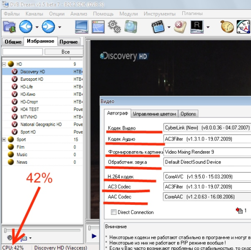 Проблему с загрузкой процессора решил, не заменой программы на DVB Viewer, а правильным подбором кодеков они тоже влияют на загрузку процессора скрин подтверждает. Второй момент на компе имею две ОС W7 и XPSP3, просмотра шд каналов добился на XPSP3, на семерке не получаться хоть тресни, то есть подергивание подвисание картинки. На XPSP3 все каналы идут хорошо , но футбол, хоккей спортивные где передвигаются быстро тут немного идет (ели,ели подергивание), смотреть можно но хочется лучшего. А вооще хотелось бы добиться результатов просмотра на семерке, но ни как невыходит